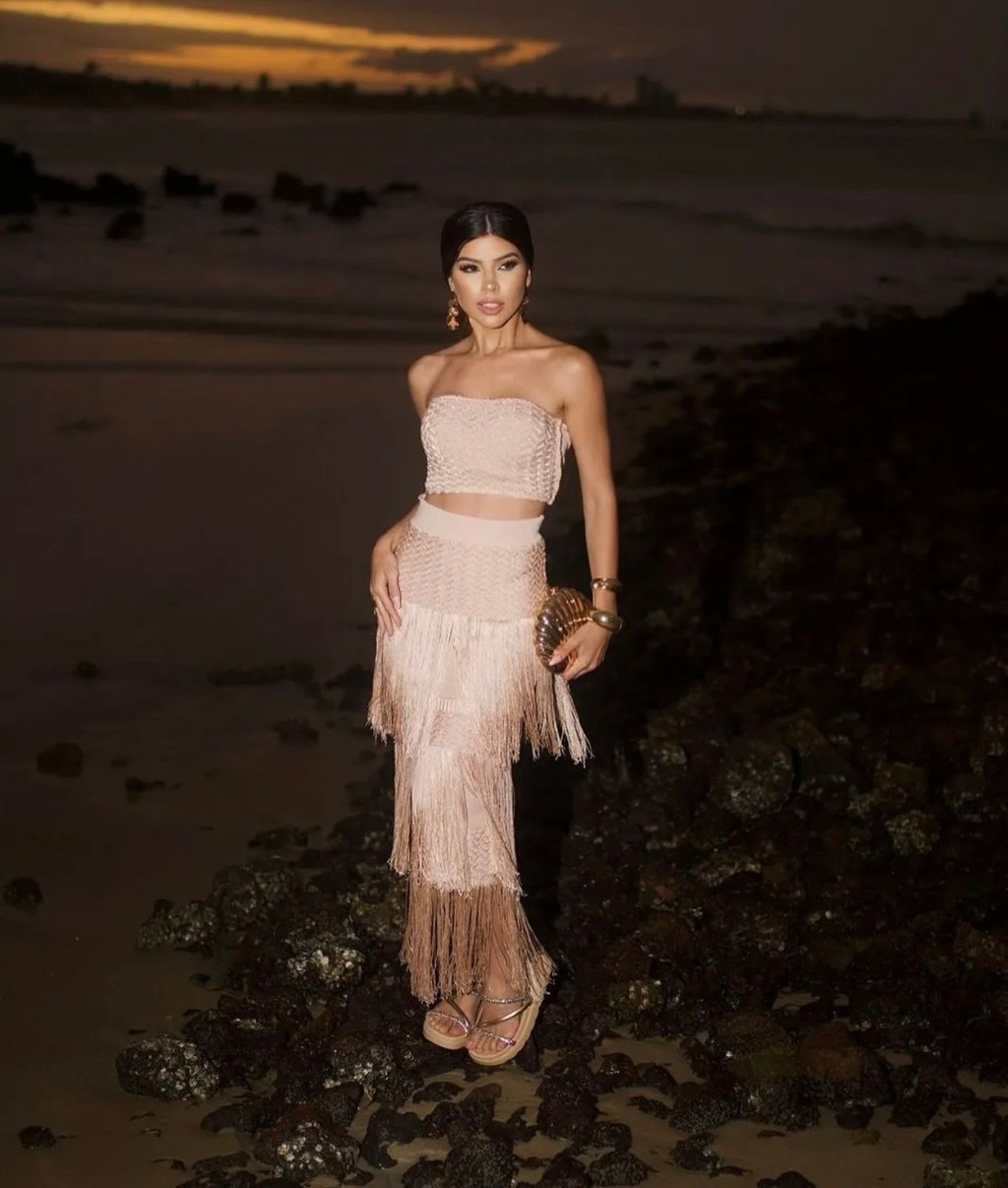 Conjunto Leblon: un sofisticado conjunto tejido en rayón, ideal para celebraciones especiales veraniegas. Su diseño con flecos en tendencia añade un toque de elegancia y frescura, perfectos para los días calurosos.